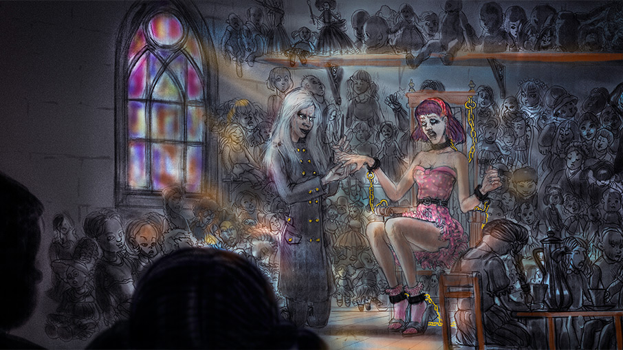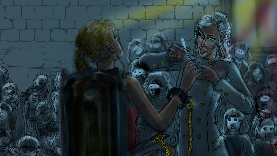 La habitación de muñecas la forma una colección de todos los estilos y épocas. Será completada por Ámbar, la muñeca de carne y hueso que pasa a ser objeto de adoración de la mente enferma de Helga.